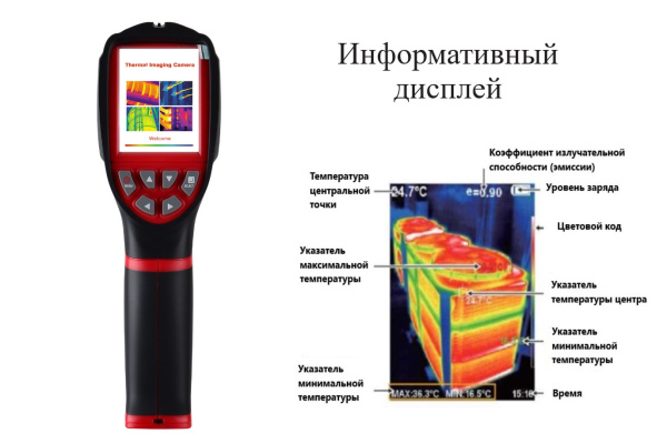 <li>Яркий и контрастный LED-дисплей 2,8” с матрицей 200х150 пикселей с индикацией текущих значений температуры центральной точки указателя, точек MAX и MIN температуры в поле зрения, цветового кода температуры, уровня заряда, сигнала тревоги, текущей даты и времени, единиц измерения – чёткий визуальный контроль соблюдения или нарушения установленного режима температуры.</li>
