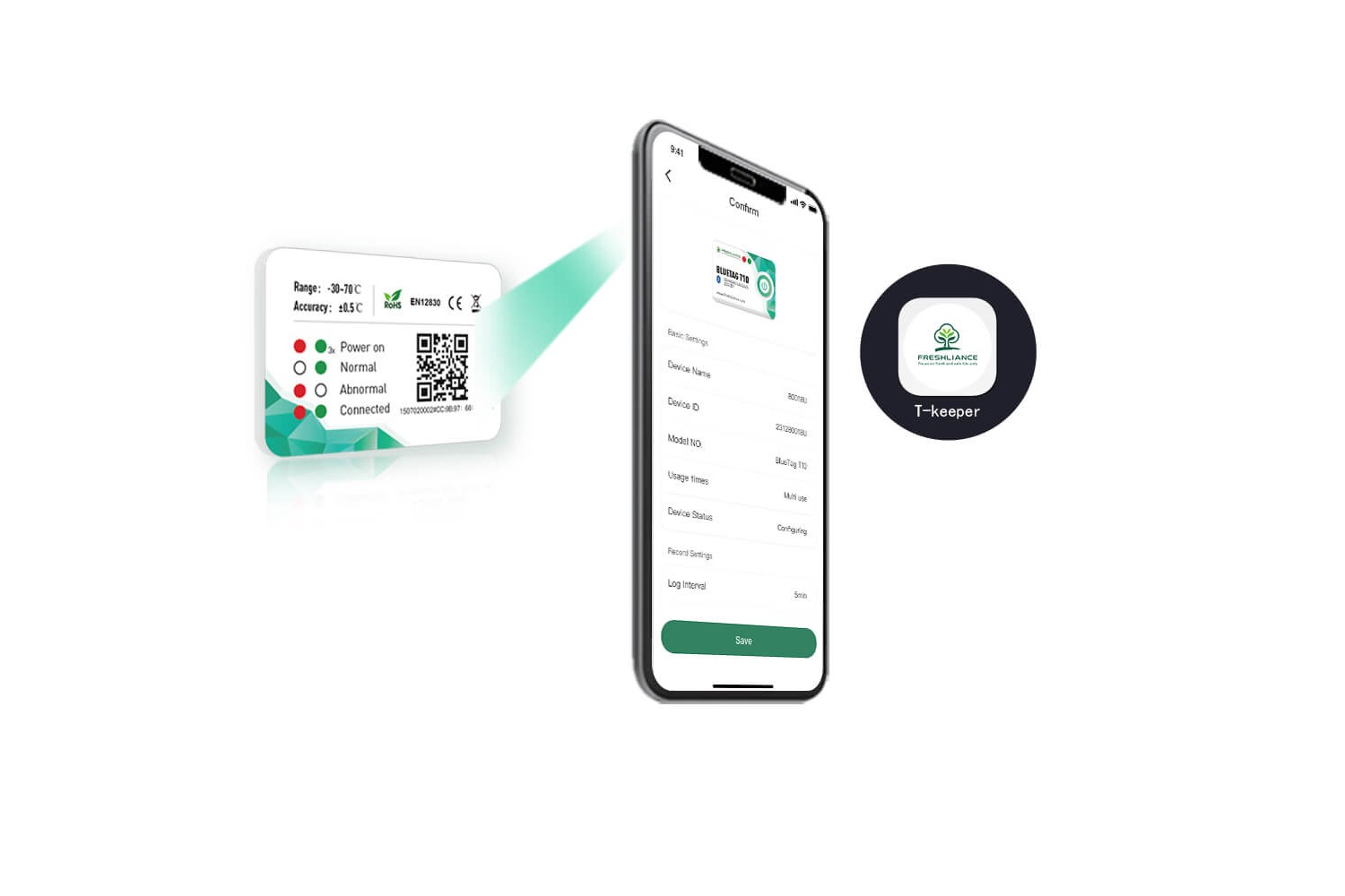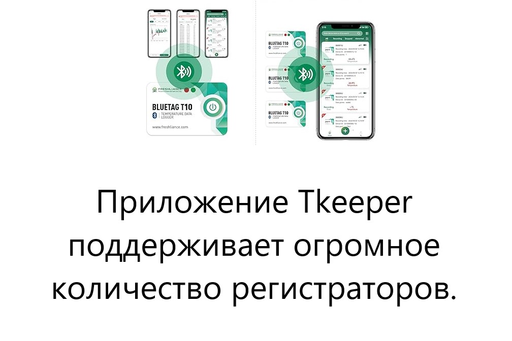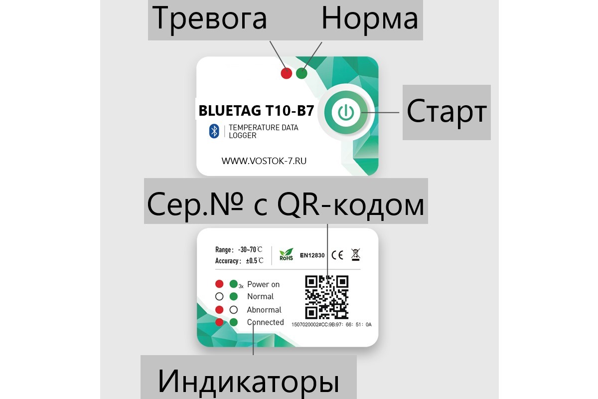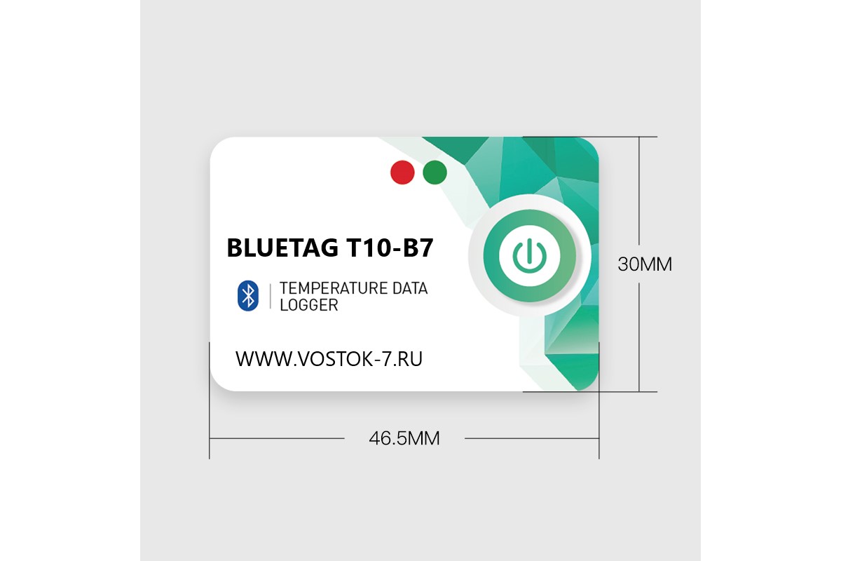 - Логгеры моделей BlueTag T10-В7 конструктивно выполнены в виде компактного моноблока из поликарбоната со встроенным первичным преобразователем. На лицевой стороне корпуса логгеров расположена кнопка «Старт/Стоп» и световые индикаторы. На оборотной стороне логгеров расположены органы управления и индикации. Считывание информации в режиме реального времени происходит с помощью приложения T-Keeper для гаджетов строго с операционной средой на базе Андроид. Считывание информации, накопленной в памяти устройств, происходит в формате PDF или CSV отчёта, формируемого с помощью приложения T-Keeper.