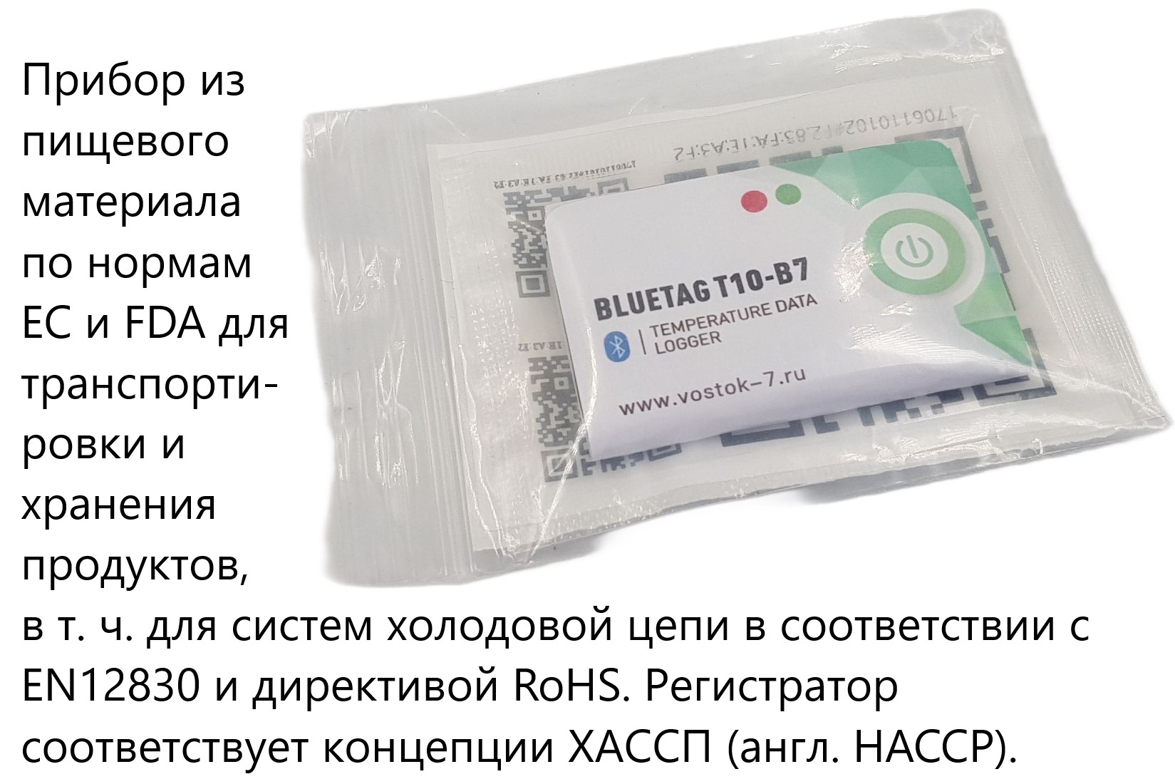 - Прибор из пищевого материала по нормам ЕС и FDA для транспортировки и хранения продуктов, в т. ч. для систем холодовой цепи в соответствии с EN12830 и директивой RoHS. Прибор соответствует концепции ХАССП (англ. HACCP).