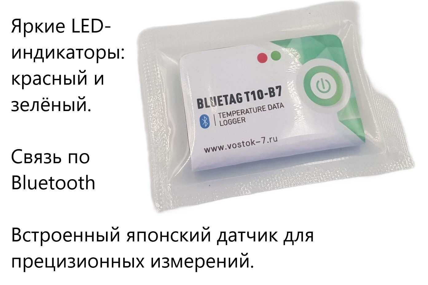Регистратор температуры (дата-логгер) многоразовый стационарный модель BlueTag T10-В7 с Bluetooth со встроенным датчиком температуры (одноканальный) представляет собой компактный моноблок из поликарбоната со встроенным сенсором, без дисплея, со световыми индикаторами и кнопкой управления.