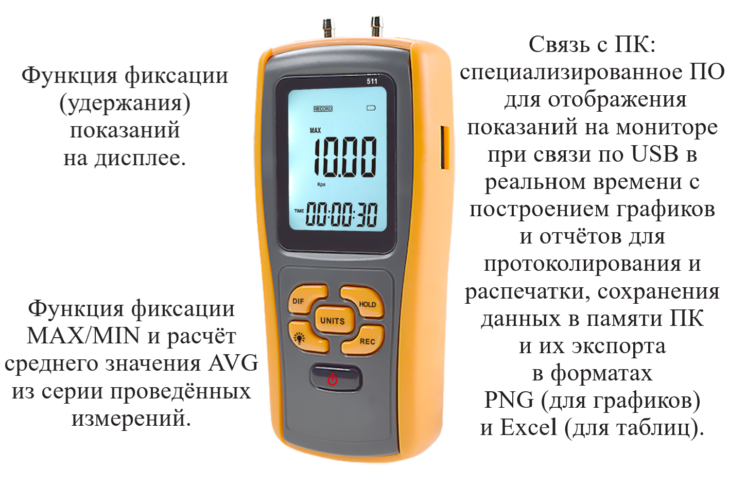 Связь с ПК: специализированное ПО для отображения показаний на мониторе при связи по USB в реальном времени с построением графиков и отчётов для протоколирования и распечатки, сохранения данных в памяти ПК и их экспорта в форматах PNG (для графиков) и Excel (для таблиц)