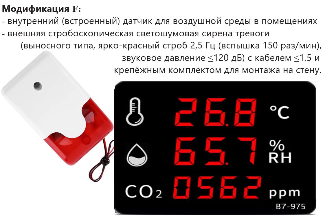 - Модификация F: внутренний (встроенный) датчик для воздушной среды в помещениях при измерении температуры (Т: -35…+75 ⁰С) и показаний относительной влажности (ОВ: 0…100 %), внешняя стробоскопическая светошумовая сирена тревоги (выносного типа, ярко-красный строб 2,5 Гц (вспышка 150 раз/мин), звуковое давление ≤120 дБ) с кабелем ≤1,5 и крепёжным комплектом для монтажа на стену. Погрешность при измерении температуры: ±1 0С