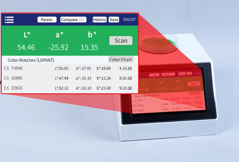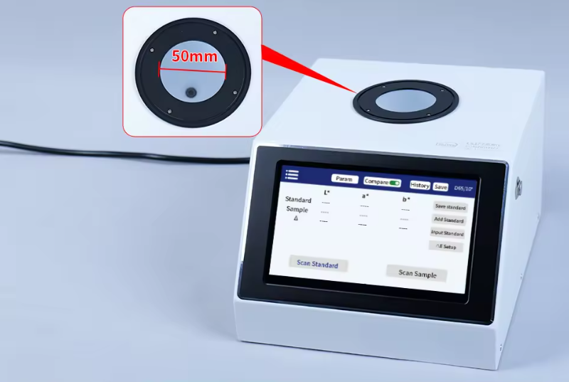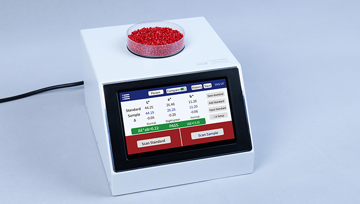 Прибор представляет собой многофункциональный широкоапертурный спектроспектрофотометр. Он оснащён 7-дюймовым цветным IPS-дисплеем и сенсорной панелью, которые обеспечивают превосходный уровень эксплуатации. Прибор позволяет формировать многоцветные диаграммы и быстро сопоставлять измеренные цветовые показатели с наиболее близким цветовым кодом. Прибор также имеет функцию сравнения разницы в цвете. Для реализации функции быстрого тестирования контроля качества устанавливается пороговое значение цветовых различий. Прибор также может подключаться к мобильному приложению для измерения цвета и передачи измеренных данных. Он также оснащён мощным программным обеспечением для ПК, удовлетворяющим различным потребностям клиентов.
