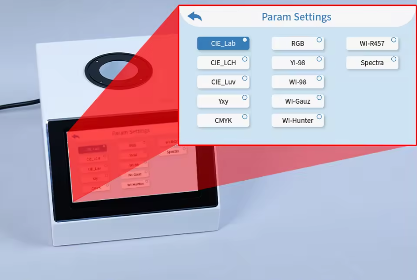 CIE Lab, Luv, LCh, Yxy, CMYK, RGB, WI-98, WI-Gauz, WI-Hunter, YI-98, WI-R457, Reflectance |