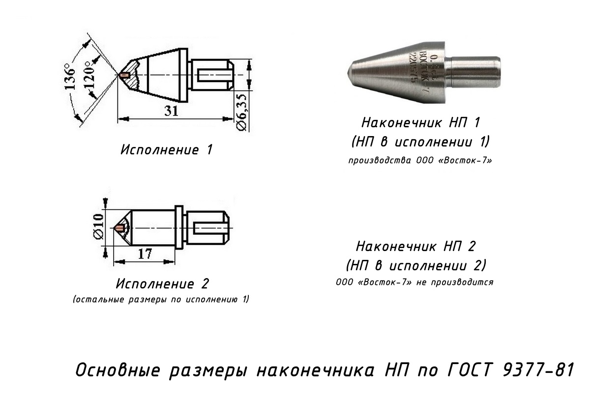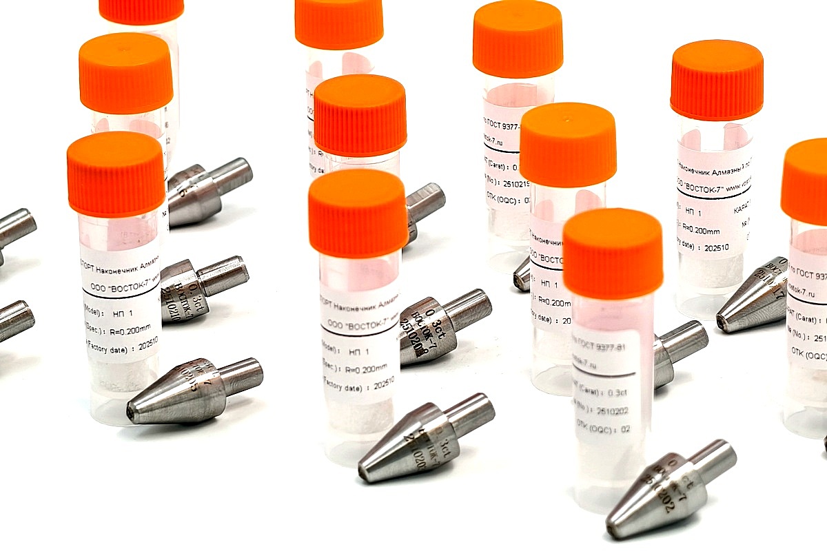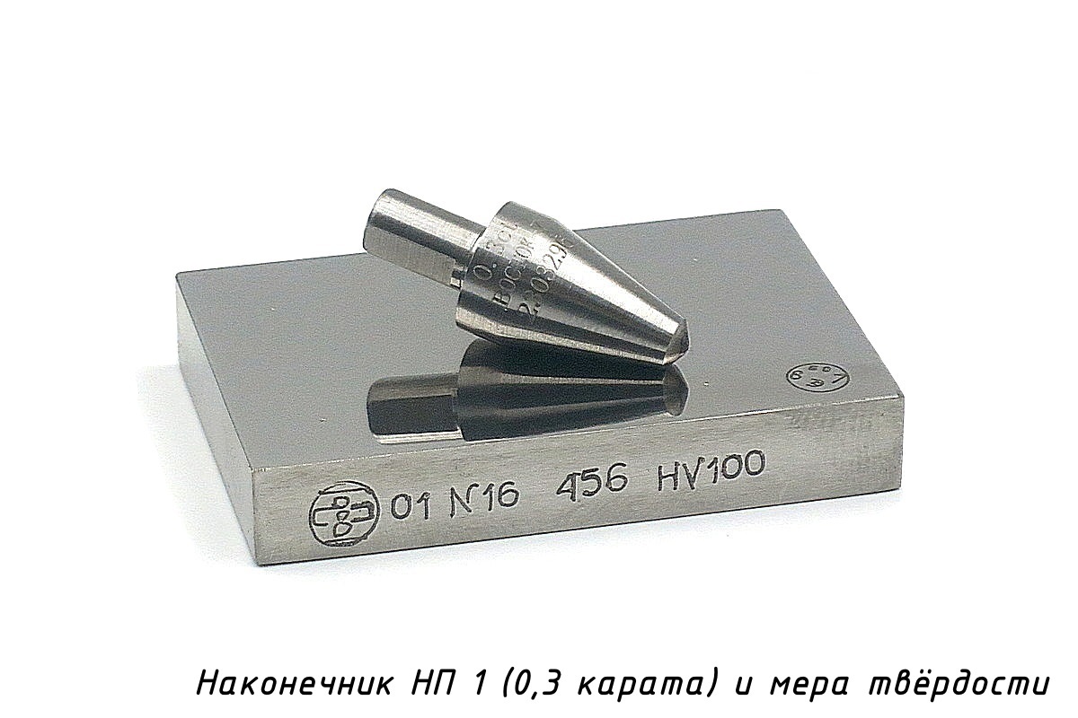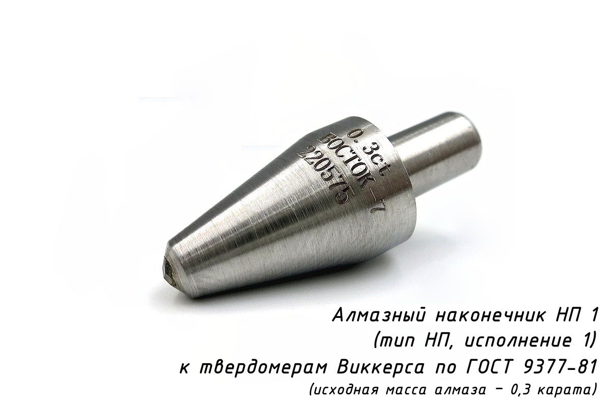 Наконечник алмазный НП 1 с алмазом исходной массы 0,3 карата — с рабочей частью в виде четырёхгранной пирамиды с углом 136° к приборам для измерения твёрдости металлов и сплавов по методу Виккерса. Наконечники изготовлены в соответствии с ГОСТ 9377-81 и прошли первичную поверку при выпуске из производства по ГОСТ 8.044-80.