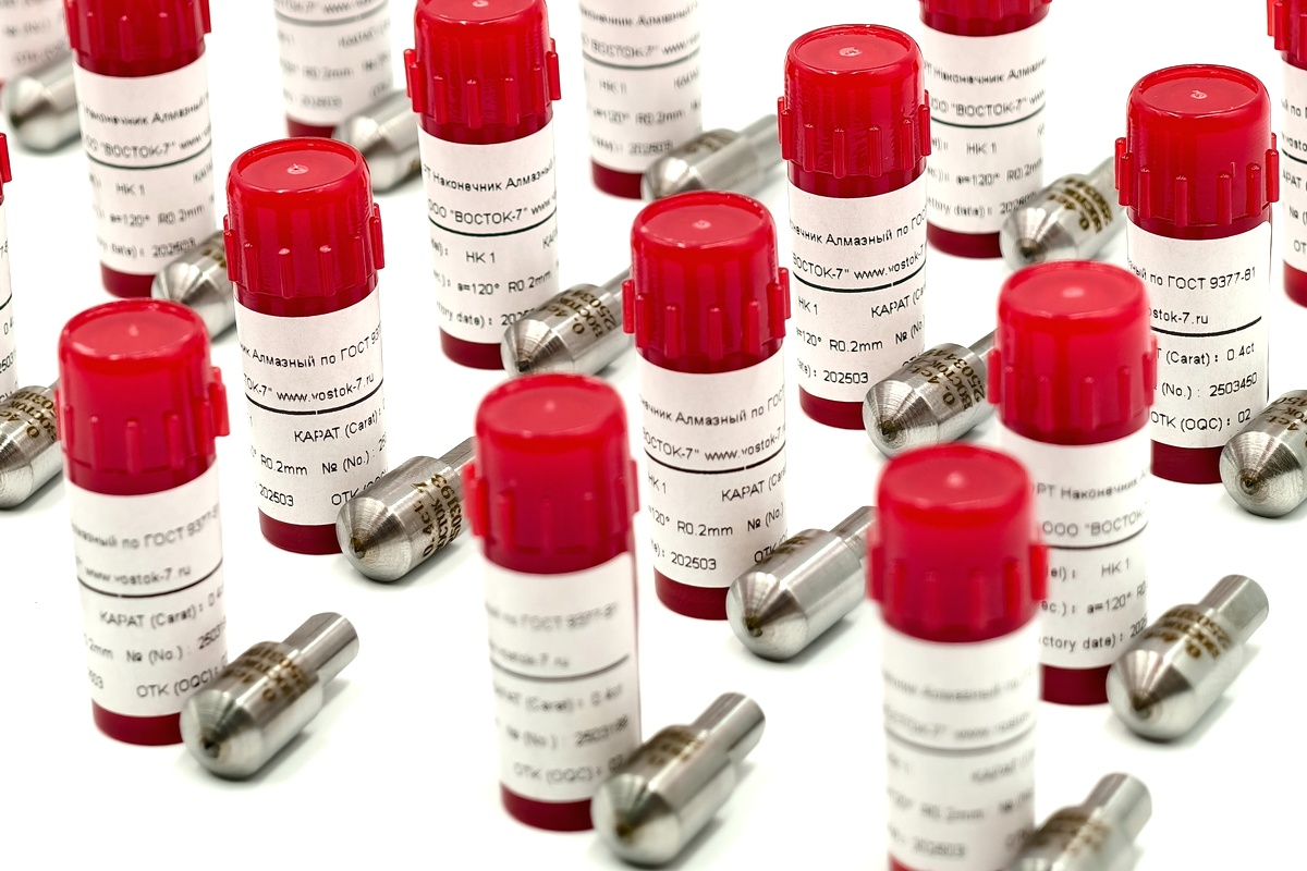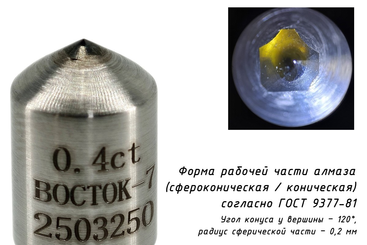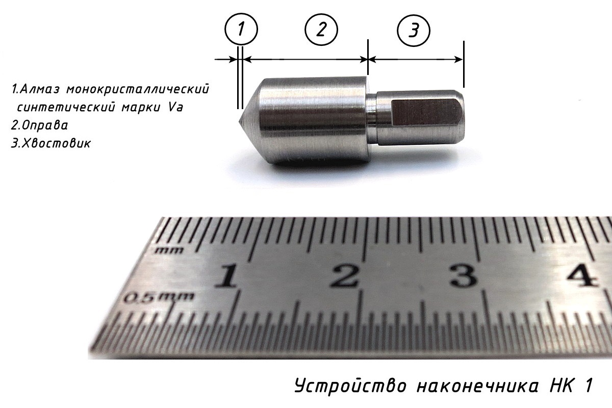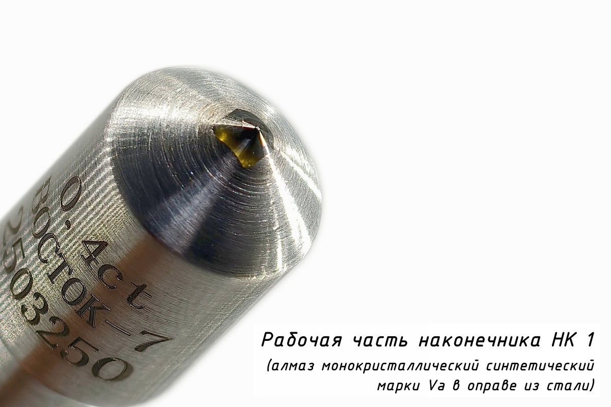 Наконечник алмазный НК 1 с алмазом исходной массы 0,4 карата — индентор с рабочей частью в виде конуса к приборам для измерения твёрдости по методу Роквелла и Супер-Роквелла. Наконечники изготовлены в соответствии с ГОСТ 9377-81 и прошли первичную поверку при выпуске из производства по ГОСТ 8.044-80.