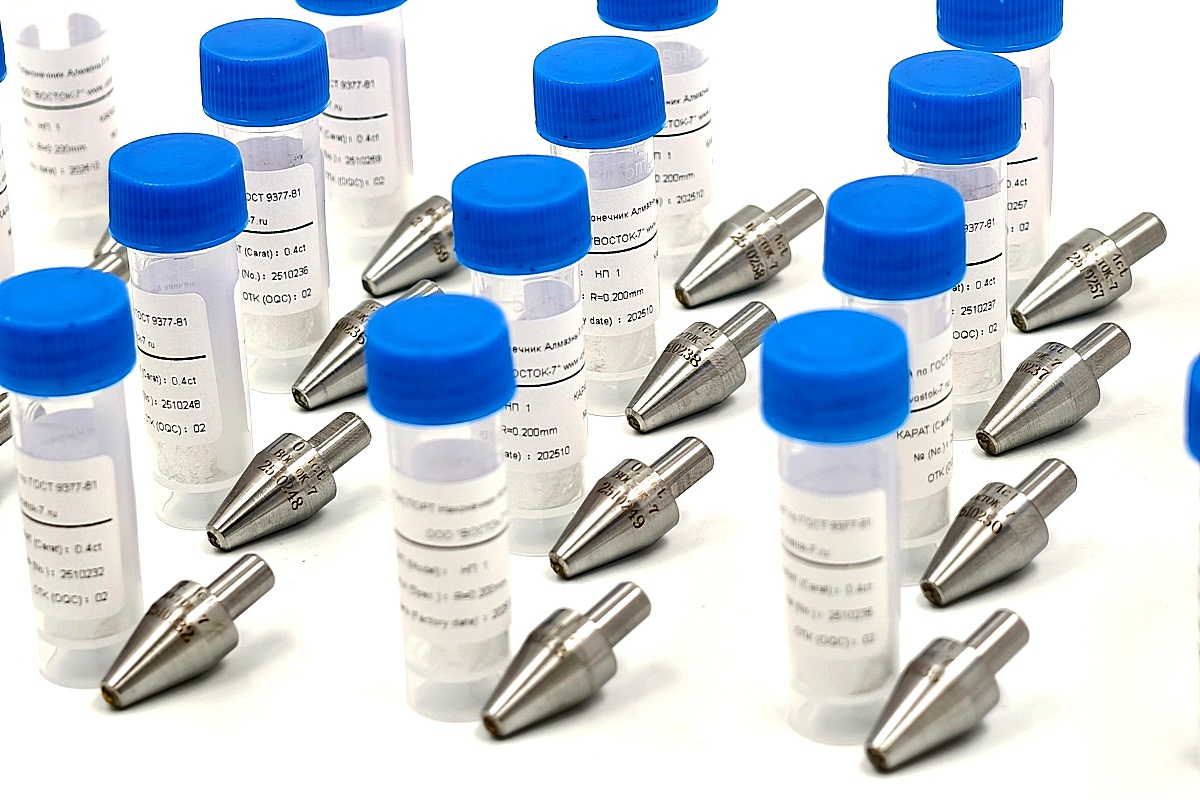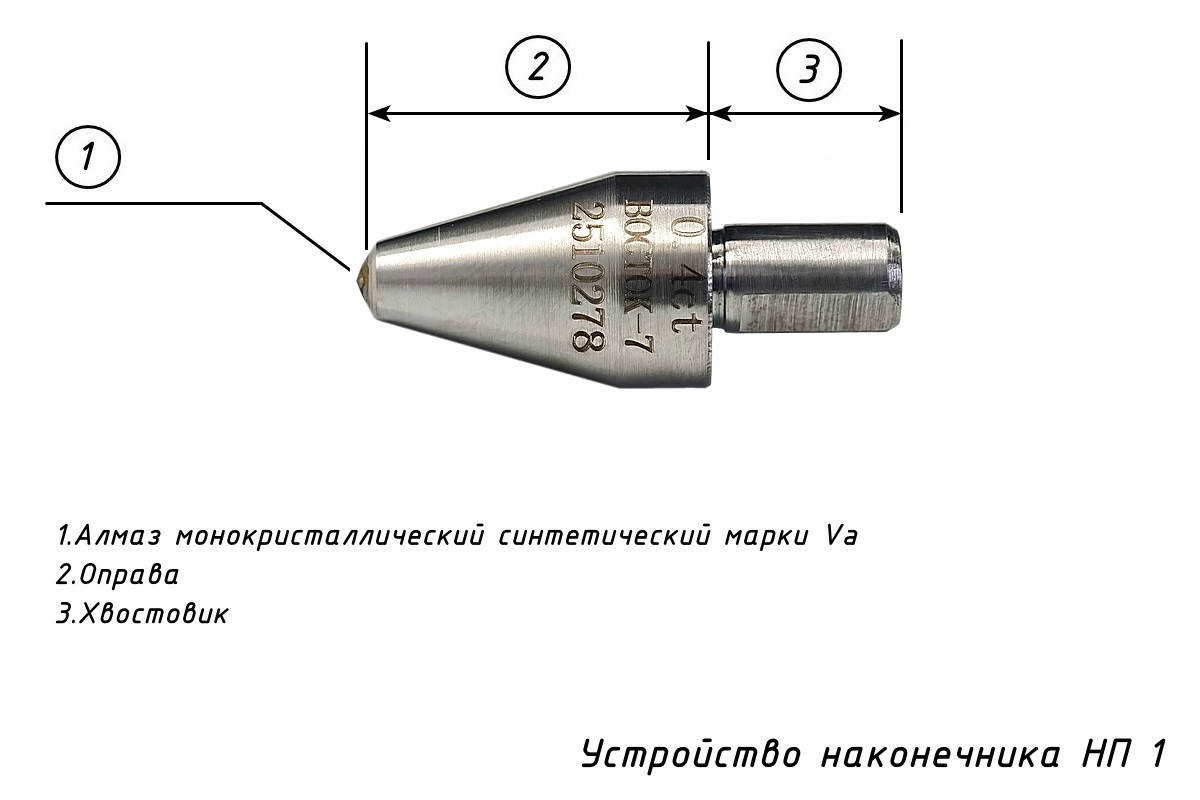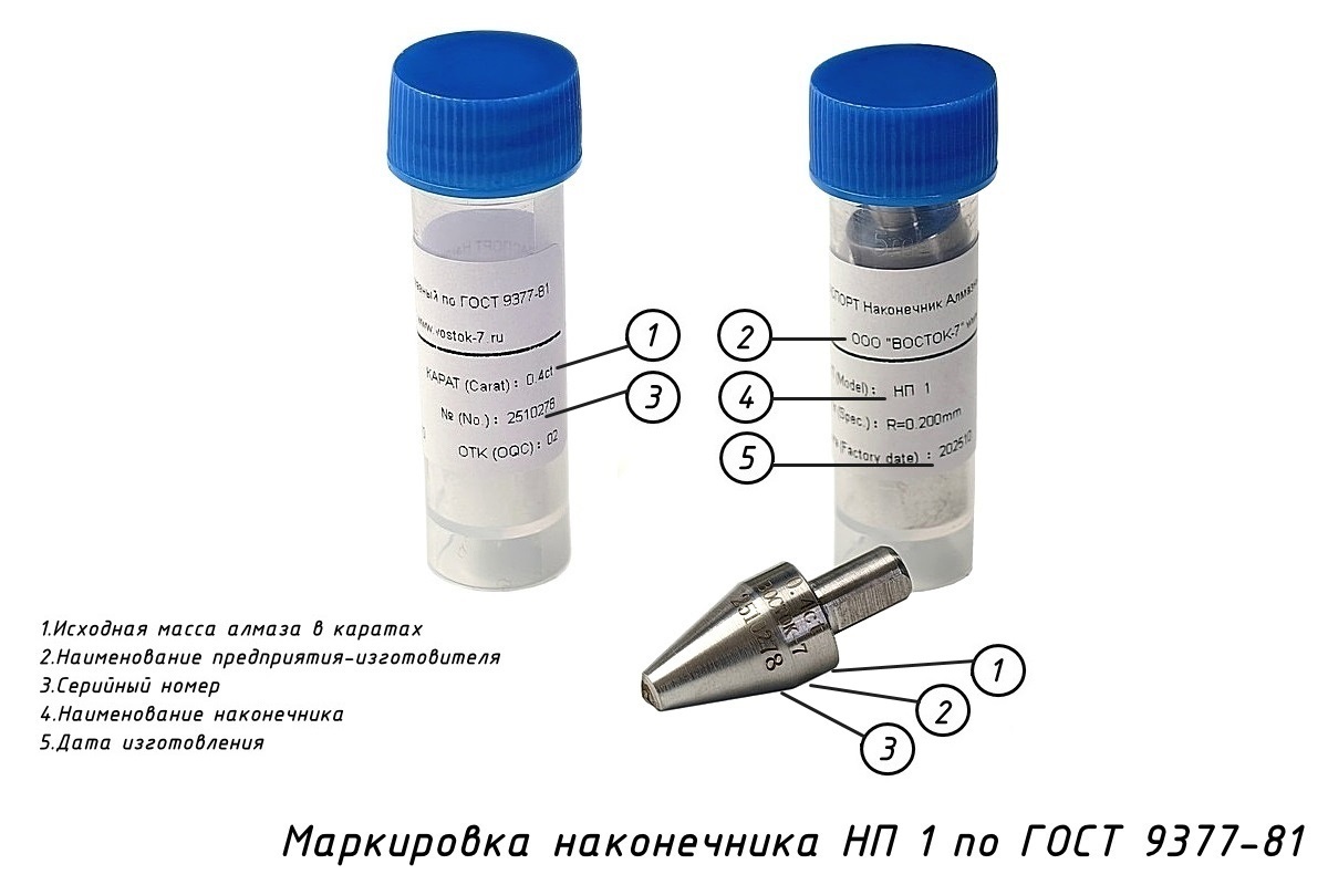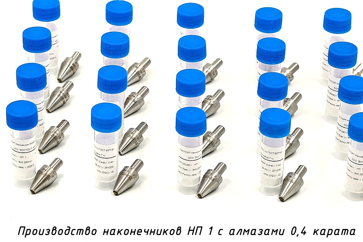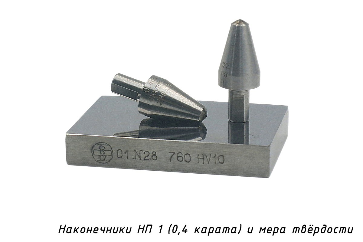 Наконечник алмазный НП 1 с алмазом исходной массы 0,4 карата — с рабочей частью в виде четырёхгранной пирамиды с углом 136° к приборам для измерения твёрдости металлов и сплавов по методу Виккерса. Наконечники изготовлены в соответствии с ГОСТ 9377-81 и прошли первичную поверку при выпуске из производства по ГОСТ 8.044-80.