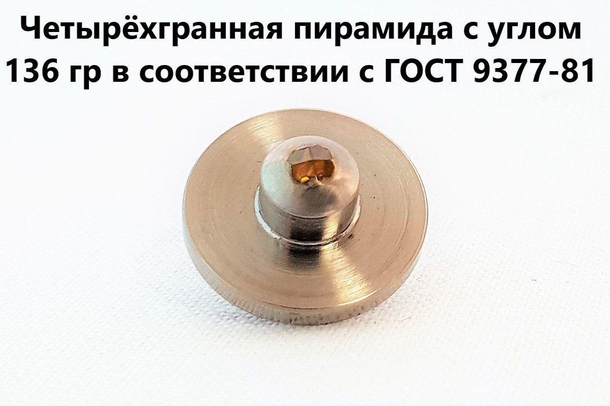 Наконечники алмазные в виде четырёхгранной пирамиды с углом 1360 к приборам для измерения микротвёрдости металлов и сплавов по методу Виккерса. Наконечники изготовлены в соответствии с ГОСТ 9377-81 и прошли первичную поверку при выпуске из производства по ГОСТ 8.044-80.<br>