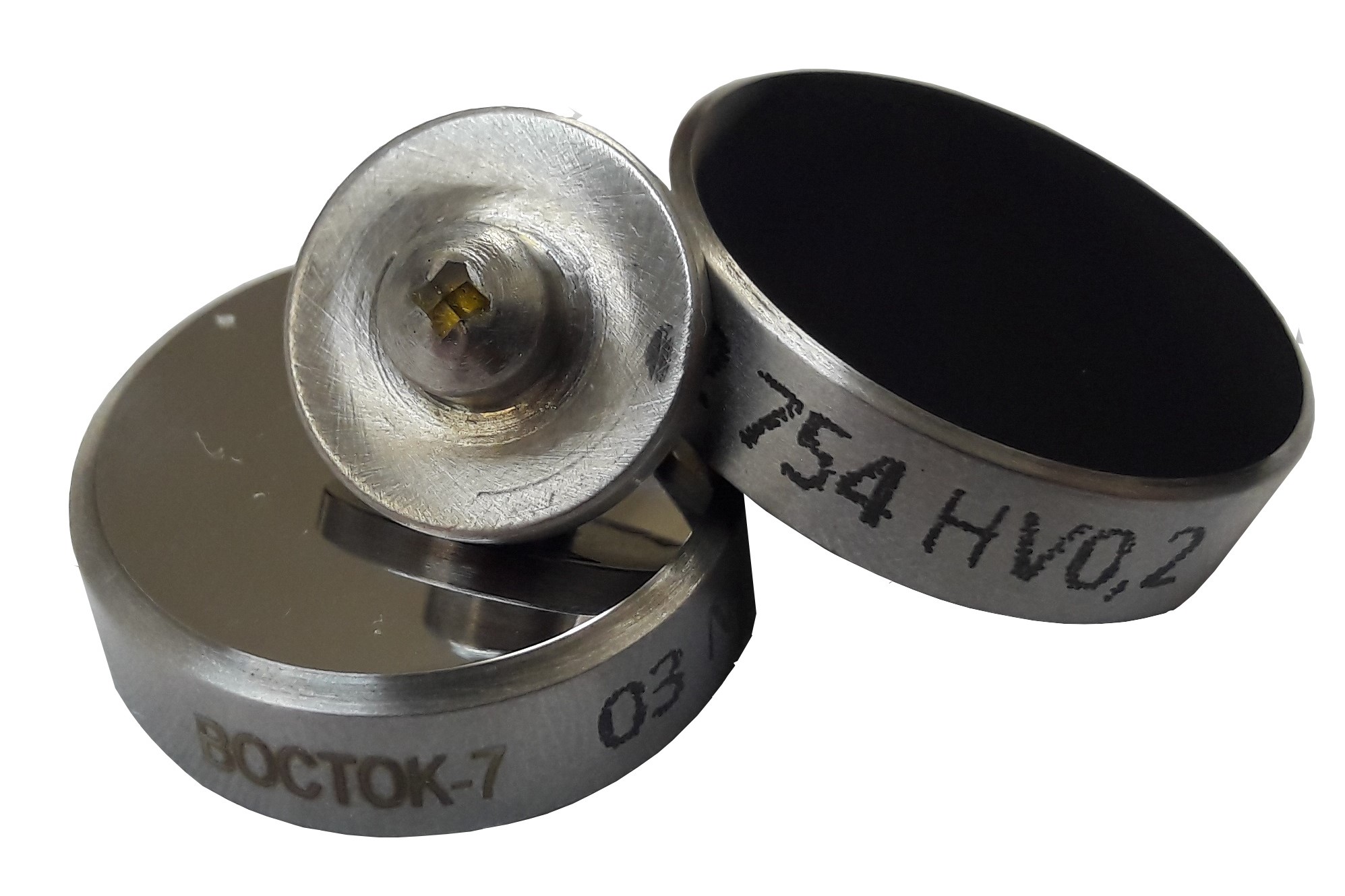 - Обжать индентор: троекратно приложить основную нагрузку для укола индентором в различных местах рабочей поверхности меры микротвёрдости.