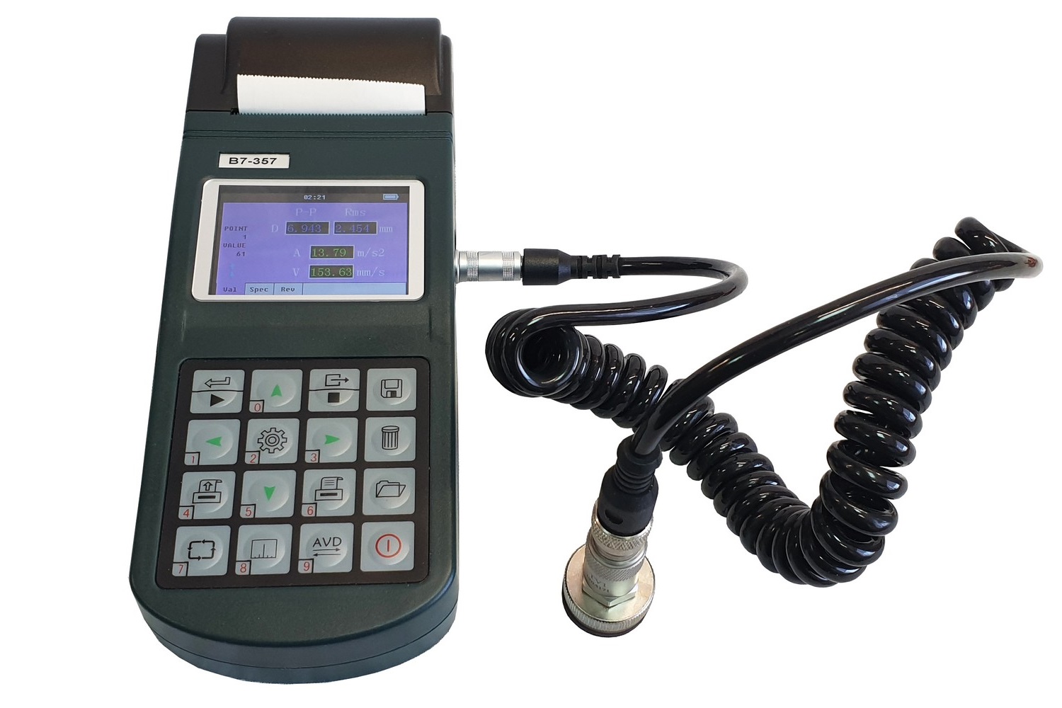 Виброметр В7-357 измеряет среднее квадратическое значение виброскорости, амплитудное значение виброускорения, размах виброперемещений, отображает на ярком цветном дисплее TFT 3.5” и распечатывает на принтере спектральные диаграммы в реальном времени при контроле дисбаланса и несоосности подшипников качения и зубчатых передач, а также индицирует в реальном времени частоту вращения при контроле вибрации вращающихся и возвратно-поступательных механизмов. Прибор оснащён памятью и режимом контроля качества (предупреждения о превышении предела заданных параметров). Питание от встроенного аккумулятора и от сети. Выносной датчик прибора соединён кабелем с измерительным блоком для проведения замеров в труднодоступных местах, имеется дополнительная насадка со щупом для работы на частотах вибрации ниже 1 кГц при малых уровнях энергии, ПО для обработки данных и связи с ПК.