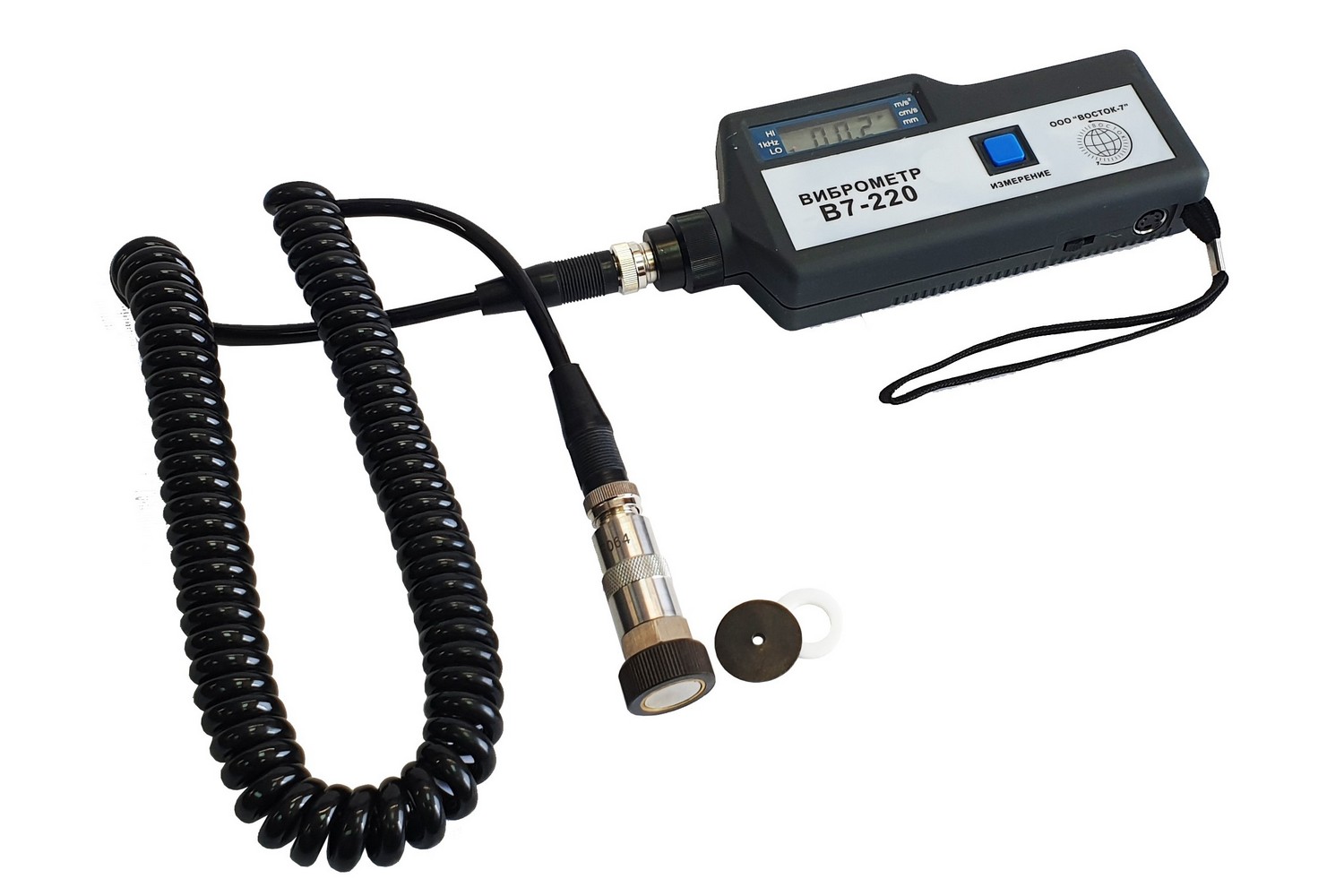 Виброметр В7-220 измеряет среднее квадратическое значение виброскорости, амплитудное значение виброускорения, размах виброперемещений, а также имеет возможность замера температуры объекта тестирования (диапазон -20…+400 0С) и наушников-стетоскопа к прибору для прослушивания звука вибрации с переключением селектора диапазона на высокую и низкую частоту. Прибор оснащён внутренним датчиком с возможностью подключения дополнительного выносного датчика (поставляется только вместе с заказанным измерительным блоком), имеется короткий щуп для измерений на высоких частотах и дополнительно можно заказать длинный щуп для измерений в диапазоне низких частот от 10 Гц до 1 кГц.